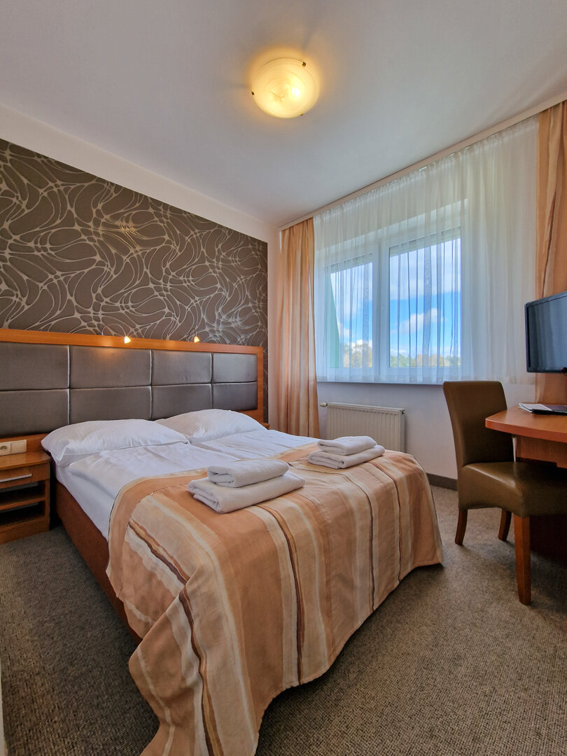 Pokój dostosowany jest dla jednej osoby, a łączna jego powierzchnia to 9m2. Pokój standardowo wyposażony jest w podwójne łóżko małżeńskie, klimatyzację, stolik nocny z lampką, biurko z krzesłem, TV-sat, lodówkę, łazienkę z kabiną oraz telefon.